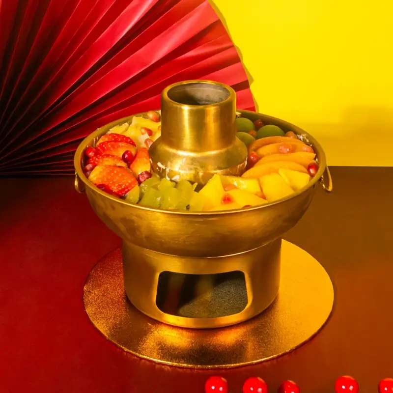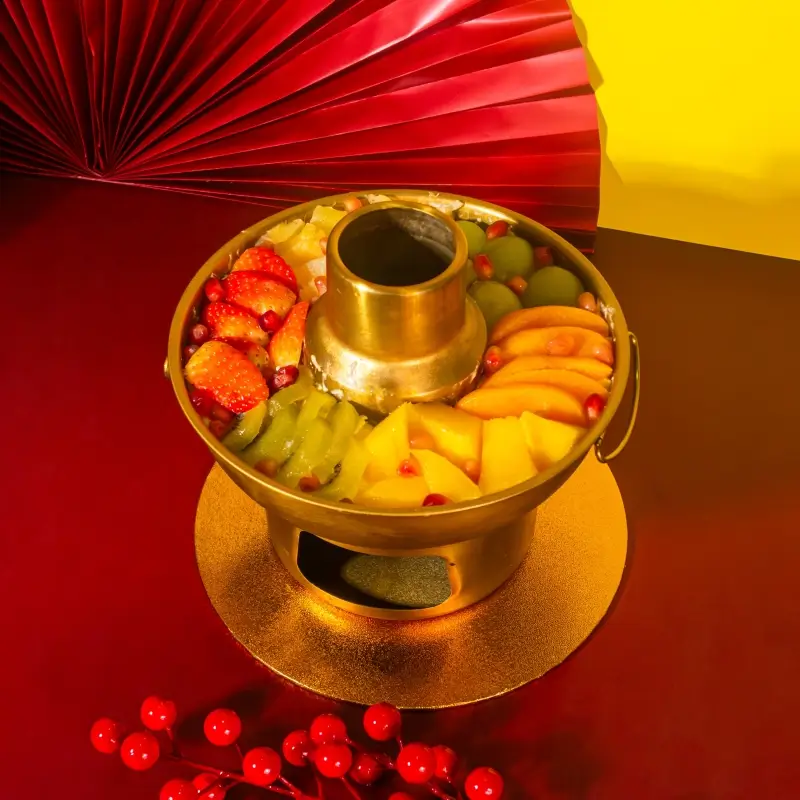 Reimagines the classic Chinese hotpot as a vibrant dessert centerpiece. Beneath the golden vessel lies a luscious mango tiramisu—light, creamy, and infused with tropical warmth. On top, a radiant ring of fresh fruits—strawberries, kiwi, mango, peaches, grapes, and pomegranate—creates a joyful burst of color and flavor.