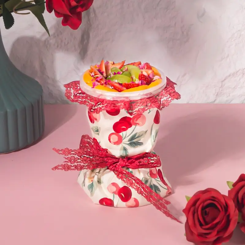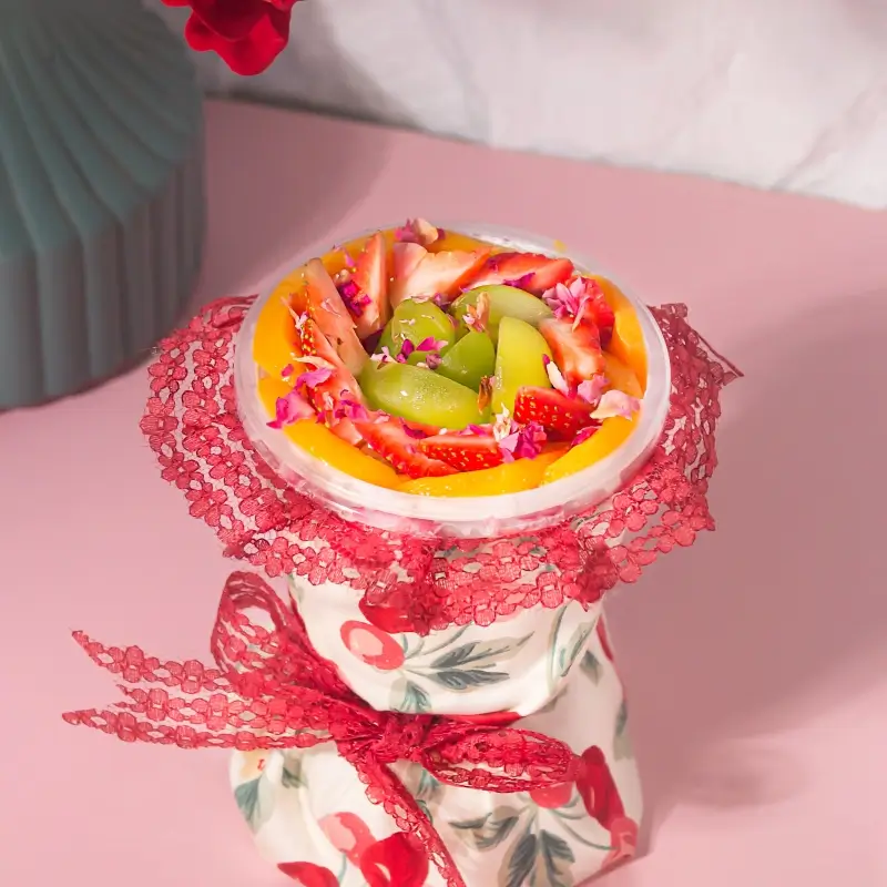 Nestled in a cherry-patterned wrap and tied with romantic red lace, this petite delight features a clear lid brimming with fresh fruits like strawberries, grapes, and peach slices. Perfect for gifting or indulging, it’s a photogenic treat , Ideal for Valentine’s, anniversaries, or any moment worth swooning over.