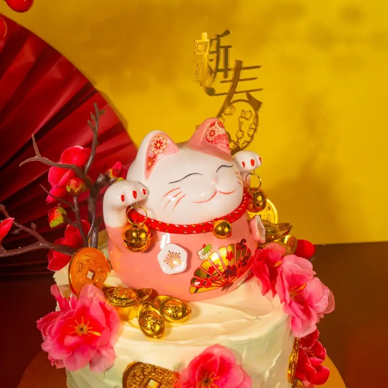 Lucky Cat Cake is a festive Lunar New Year designer cake symbolising luck, prosperity, and happiness. Featuring a cheerful maneki-neko surrounded by gold coins and blooming florals, this cake represents abundance and good fortune for the year ahead. Finished in soft festive tones with elegant details, it is perfect for celebrations, gifting, and welcoming a joyful and prosperous new beginning.